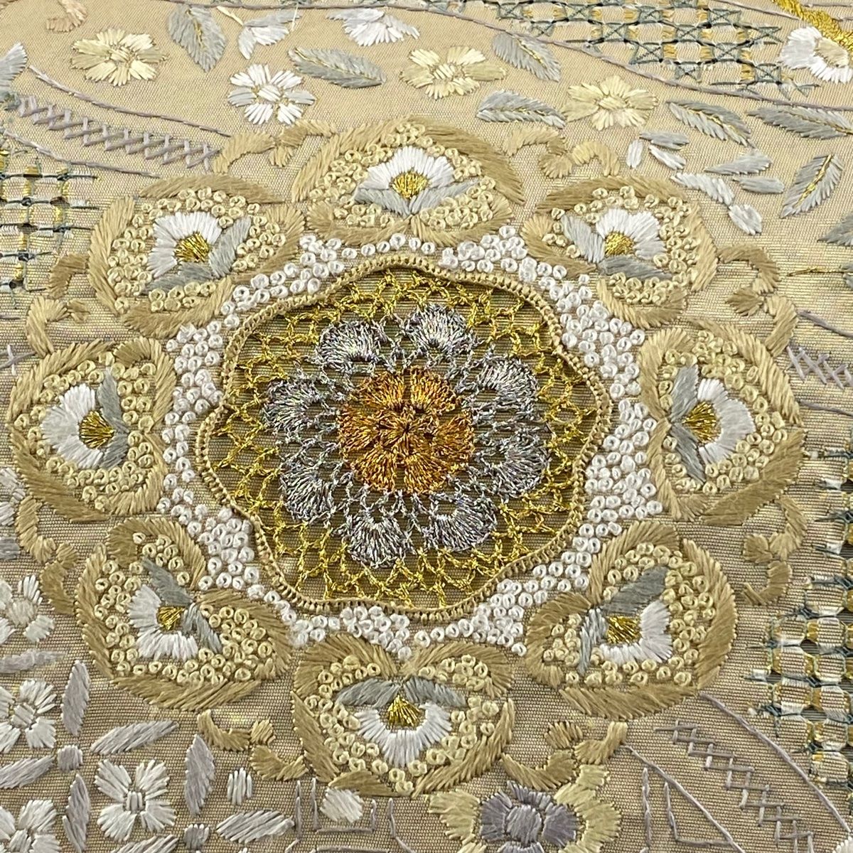 袋帯 レース 華文 草花 刺繍 金銀糸 金色 六通 正絹